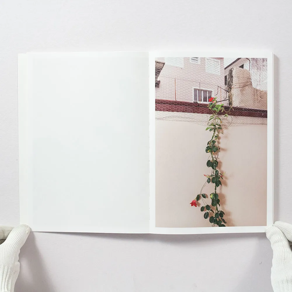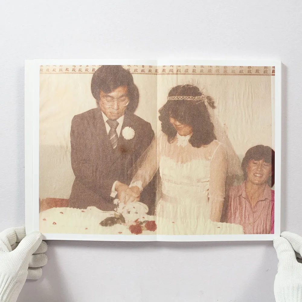 Assim como na ficção, o começo de um fotolivro é um dos momentos mais importantes, pois dará o tom de tudo o que segue e fisgará (ou não) o leitor. Em Utaki (2021), ele é muito bem-resolvido e se desdobra com serenidade e firmeza ao introduzir a casa e a família, alternando imagens de ambas para mostrar como estão fundidas. Começamos com um still borrado de um vídeo que exibe uma janela; a seguir, há um cartão aberto com uma fotografia de casamento puxada pela metade, de modo que a borda cobre o rosto dos retratados; uma foto de noivos partindo o bolo, no mesmo casamento, como um indício da gênese desse núcleo familiar; uma imagem recente do muro externo, com uma planta que escala a parede lisa e que parece servir como símbolo de uma linhagem que se ramifica; um bloco de pedra e um armário vazio, não mais utilizado pelo menino (o fotógrafo quando criança), que aparece num porta-retrato dentro dele, e a seguir em outro still de vídeo.